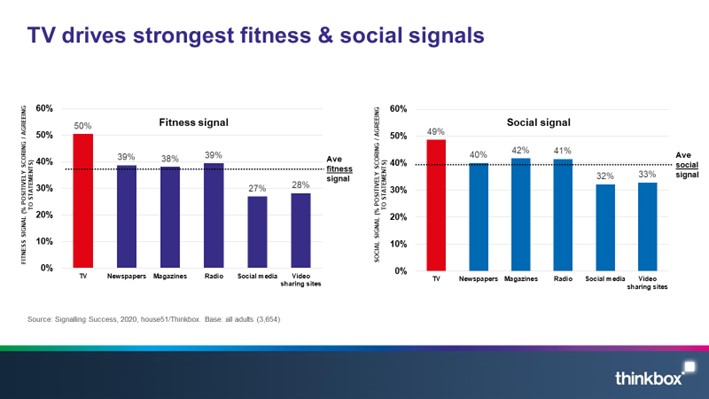 הממצאים הם חד משמעיים ומפורשים. יותר מכל מדיום אחר תורמת הטלוויזיה באופן חיובי לכלל המותגים שנבדקו בכל האיתותים. שיעור התרומה של הטלוויזיה לאיתות ה”כושר”, המחושב כממוצע אחוזים של התפיסות בתחומים המרכיבים אותו, עומד על 50%. לעומת זאת לעתונים היומיים תרומה של 39% כמוו התרומה של הרדיו. למגזינים תרומה של 38% ורק 27% ו-28% היא התרומה של הרשתות החברתיות ושל אתרי שיתוף הווידאו, בהתאמה.